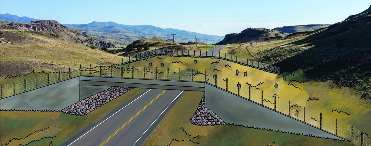 A conceptual rendering by Matthew Bell shows one of the proposed wildlife overpasses at Dome Mountain. Yellowstone Safe Passages estimates the two structures will cost $30-40 million. RENDERING COURTESY OF MATTHEW BELL / WILD ENGINEERING GROUP