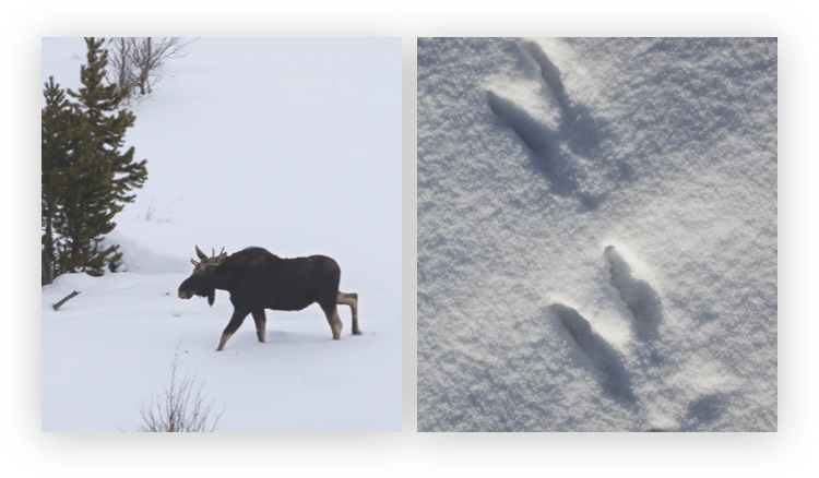 Left: A bull moose walks through the snow, PHOTO BY NPS / ADDY FALGOUST, Right: Moose tracks in the snow, ADOBE STOCK PHOTO