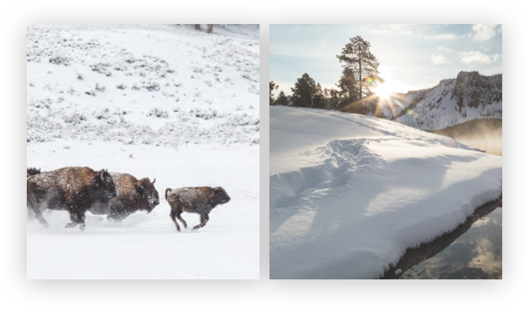 Left: Bison, Lamar Valley, PHOTO BY NPS / NEAL HERBERT, Right: Bison tracks along the Madison River, PHOTO BY NPS / JACOB W. FRANK